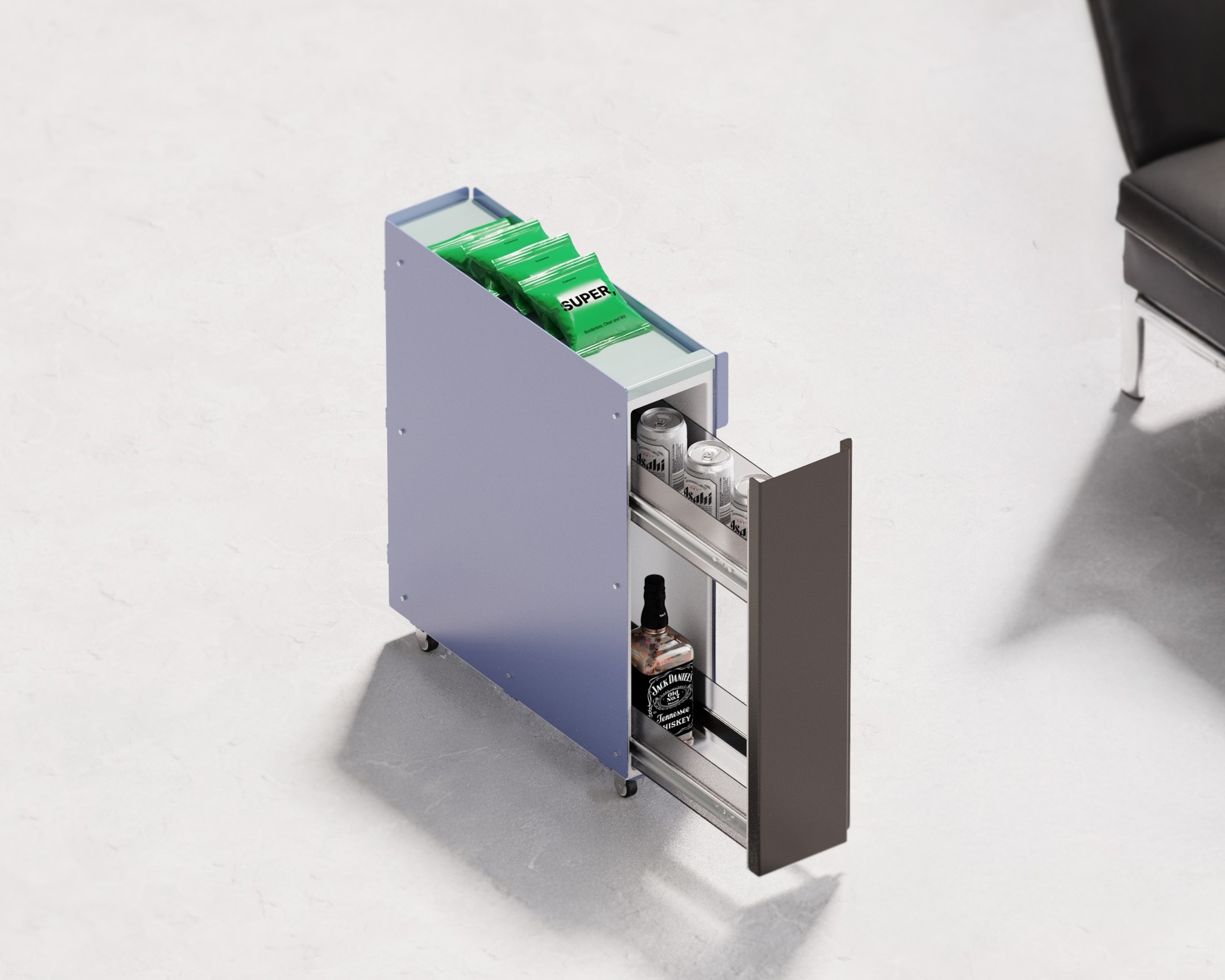 Unlike conventional refrigerators, CONECTO is dedicated to beverages. It stores cans and bottles of different sizes with ease, and thanks to the built-in wheels, it functions as a trolley that can be moved wherever it’s needed. Whether placed next to the sofa during a movie night, in a compact office corner, or tucked into a narrow kitchen space, it adapts effortlessly to diverse lifestyles.