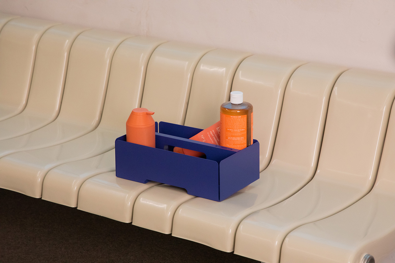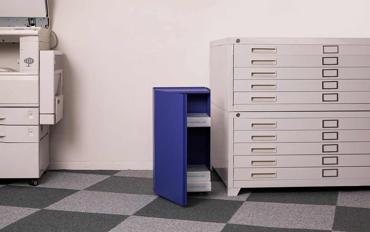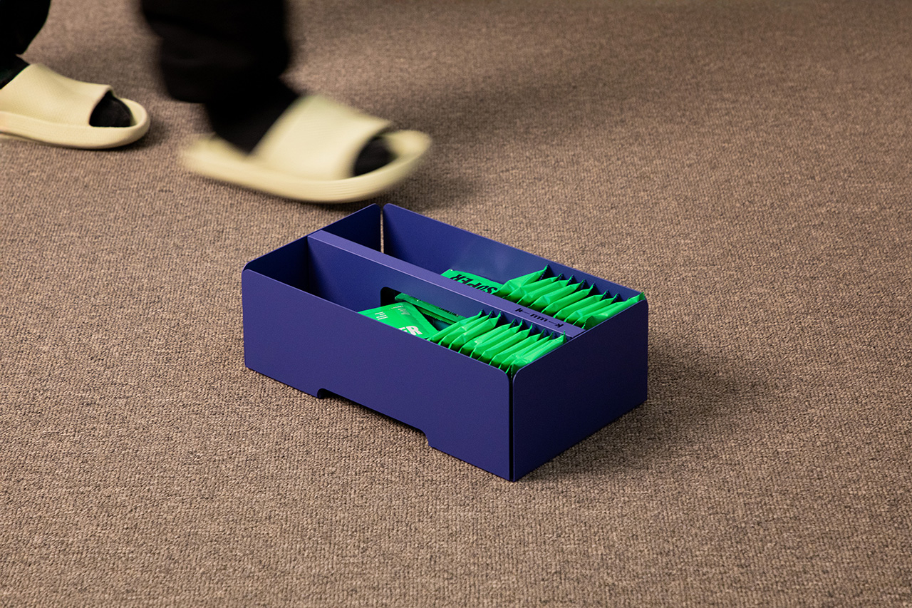 KIMMIPAK is a steel furniture piece. It has a trolley function that can be moved to different spaces and is used in various ways at each location. It can be used as a bookshelf, storage box, tray, and table. In particular, the toolbox at the top holds frequent items (garden supplies, dog beauty supplies, tools, bath supplies...) and can be quickly removed and carried around when needed.
