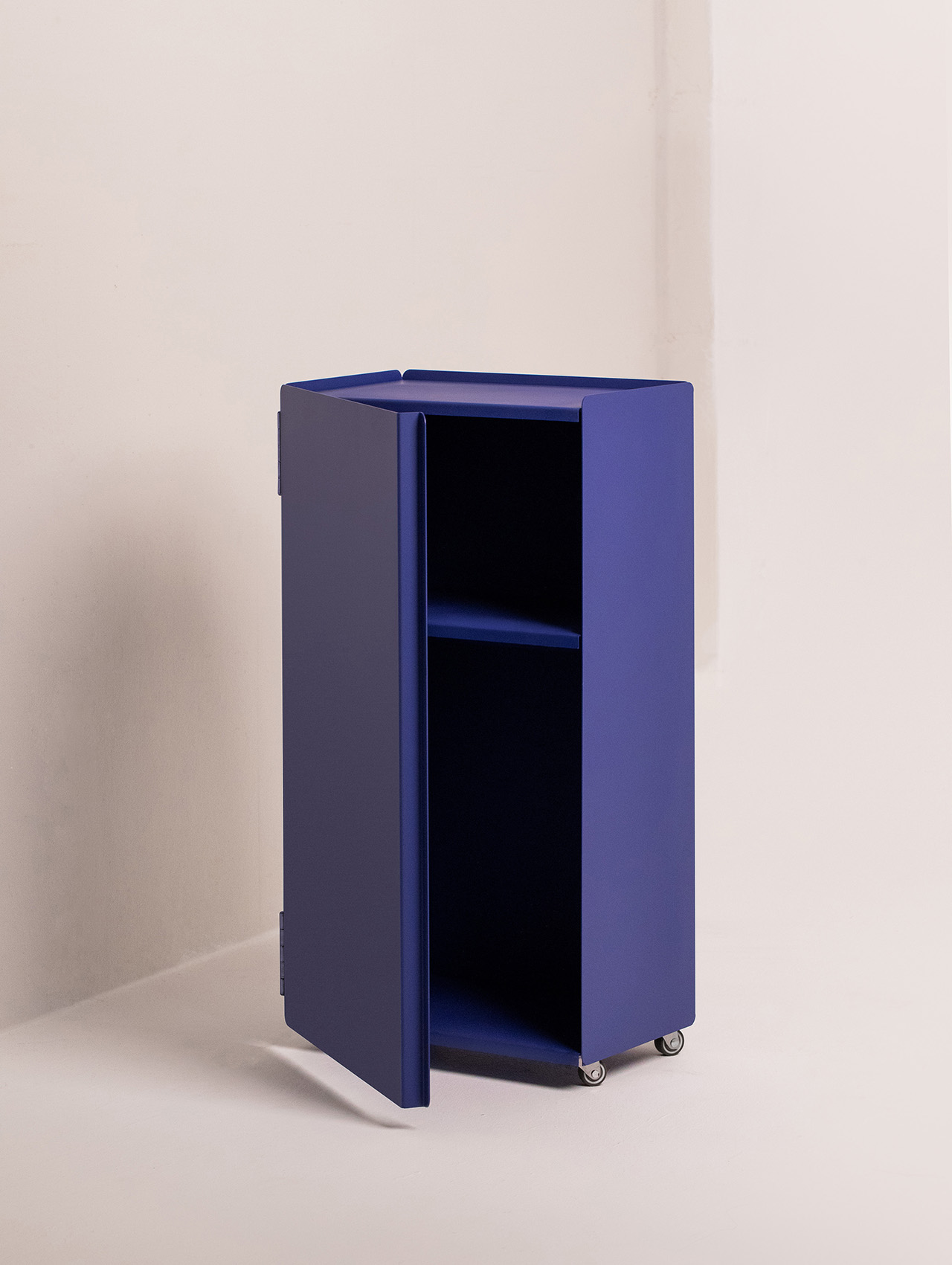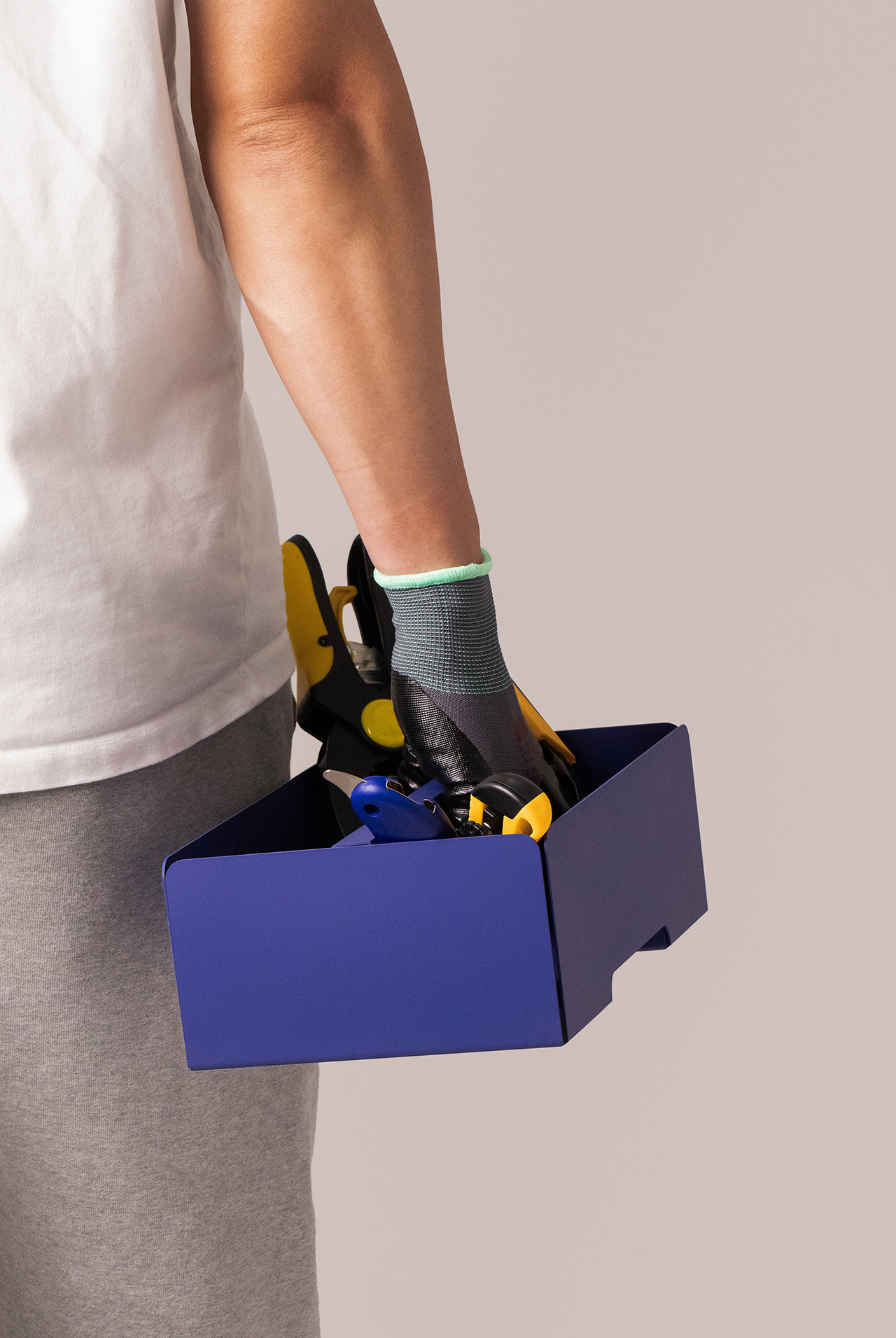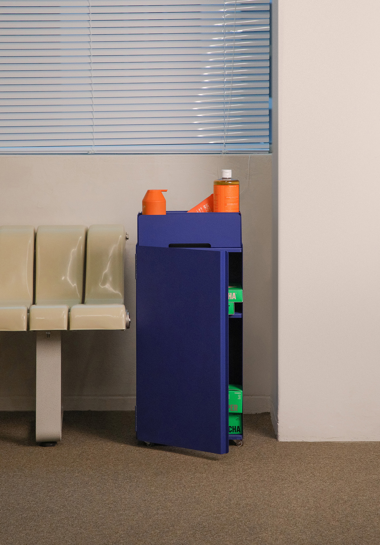KIMMIPAK is a steel furniture piece. It has a trolley function that can be moved to different spaces and is used in various ways at each location. It can be used as a bookshelf, storage box, tray, and table. In particular, the toolbox at the top holds frequent items (garden supplies, dog beauty supplies, tools, bath supplies...) and can be quickly removed and carried around when needed.